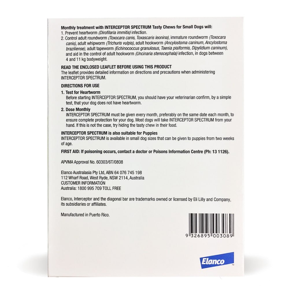 While Interceptor Spectrum is generally considered safe for small dogs, some individuals may still experience sensitivities. In rare cases, dogs may show signs such as digestive upset (including vomiting or diarrhea), temporary lethargy or depression, unsteady movement or mild tremors, and a reduced appetite. If you notice any of these signs persisting or worsening, discontinue use and consult your veterinarian immediately.