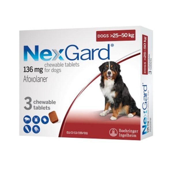 NexGard Chewables are indicated for the treatment and prevention of flea infestations (Ctenocephalides felis) and the treatment and control of tick infestations, including black-legged tick (Ixodes scapularis), American dog tick (Dermacentor variabilis), Lone star tick (Amblyomma americanum), and brown dog tick (Rhipicephalus sanguineus). This product is suitable for dogs 8 weeks of age and older, weighing 60.1-121 lbs (25.1-50 kg).